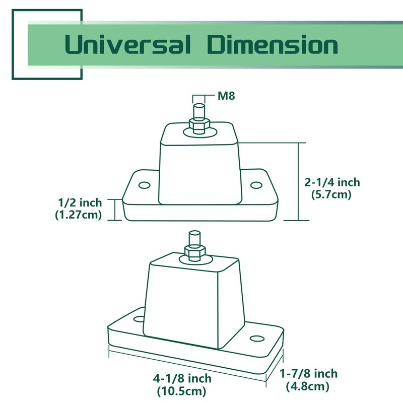 - Package Includes-The package contains 4 pack rubber vibration isolators mounting bracket with 8mm galvanized stud and nut,galvanized washer.The base size of the anti vibration pad is 5 x 11.2cm,and the height is 6cm (excluding stud).