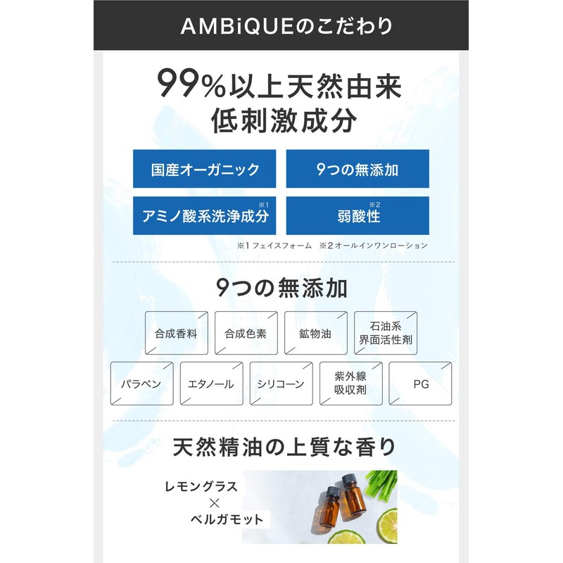 - More than 99% Naturally Hypo-allergenic Ingredient: Ambique is more than 99% natural and organic from Japan, using amino acid cleaning ingredients (face foam), weak acidic (all-in-one lotion). 9 additive-free* Hypoallergenic ingredients (*Synthetic fragrance, synthetic pigments, mineral oil, petroleum surfactant, paraben, ethanol, silicone, ultraviolet absorbers, PG)