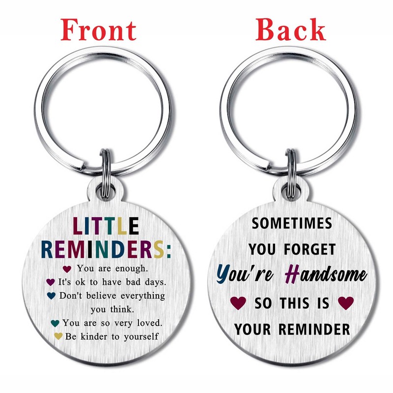 - Double Side Engraved Keychain - One side engraved LITTLE REMINDERS positive affirmations, the other side engraved SOMETIMES YOU FORGET YOU'RE HANDSOME SO THIS IS YOUR REMINDER with subtle heart symbol