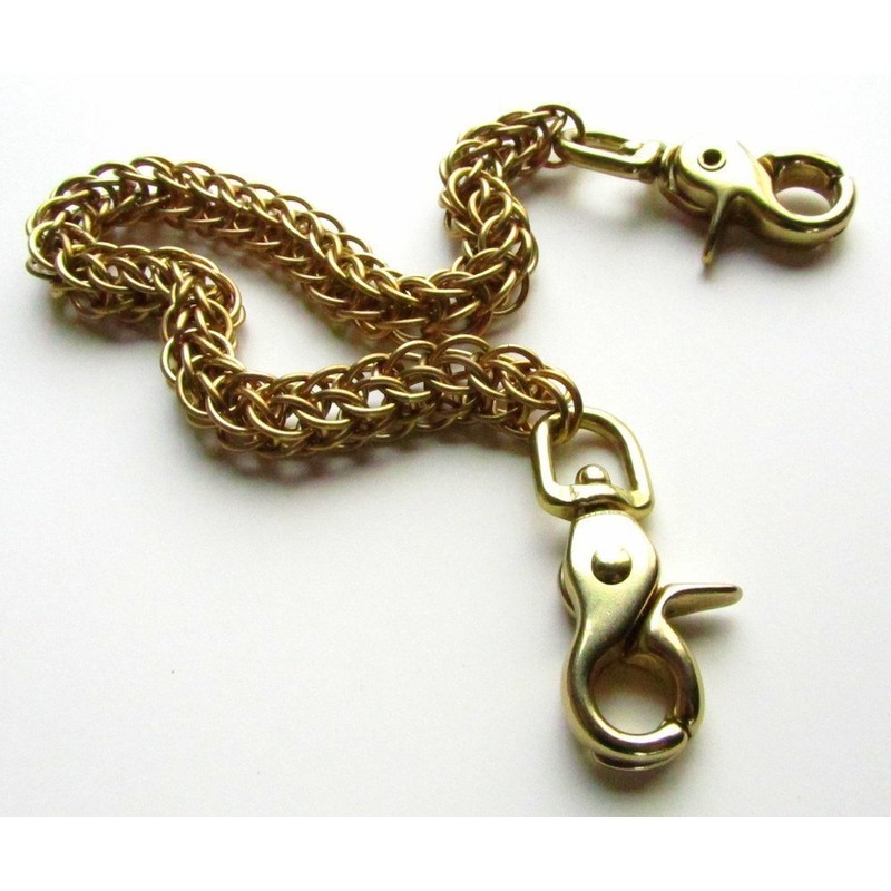 Original Style. Superior Quality. American Made. These wallet chains are hand woven link by link. They are made using the finest brass rings that we can get our hands on and finished with top quality brass clips. Heavy duty and built to last, this chain will not rust or fall apart. Available with a trigger clasp (#1), or hook (#2). 16 gauge brass chain. Measures 21 or 17 inches (53.5 cm or 43 cm) from end to end. *Wallet not included.
