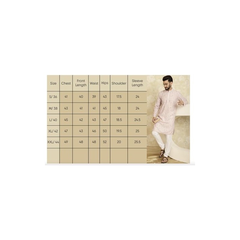 • Collar: Shirt Collar, Sleeves: Full, Fit type: Regular/ Comfort, Length: Knee length Kurta