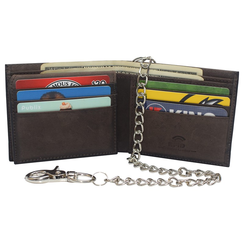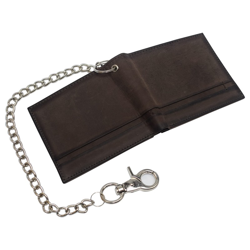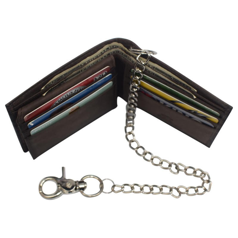 Men's Genuine Leather RFID Blocking Chain Biker Bifold Flap Up ID Wallet (Brown with Chain)