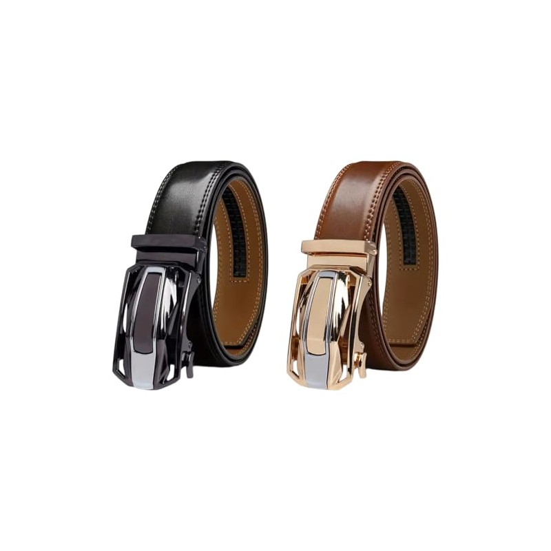 Men's Leather Ratchet Belt, Black and Brown with Metal Plate Buckle, 3.2 cm Width (Brown)