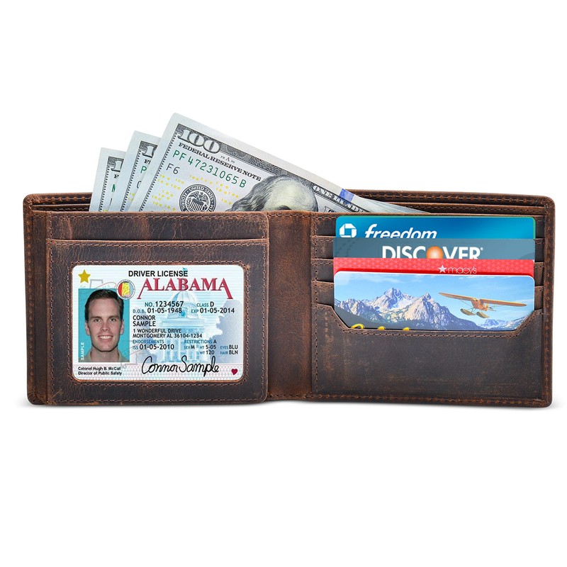 Men's Leather Wallet with RFID Blocking 2 ID Windows in Full Grain Crazy Horse Leather