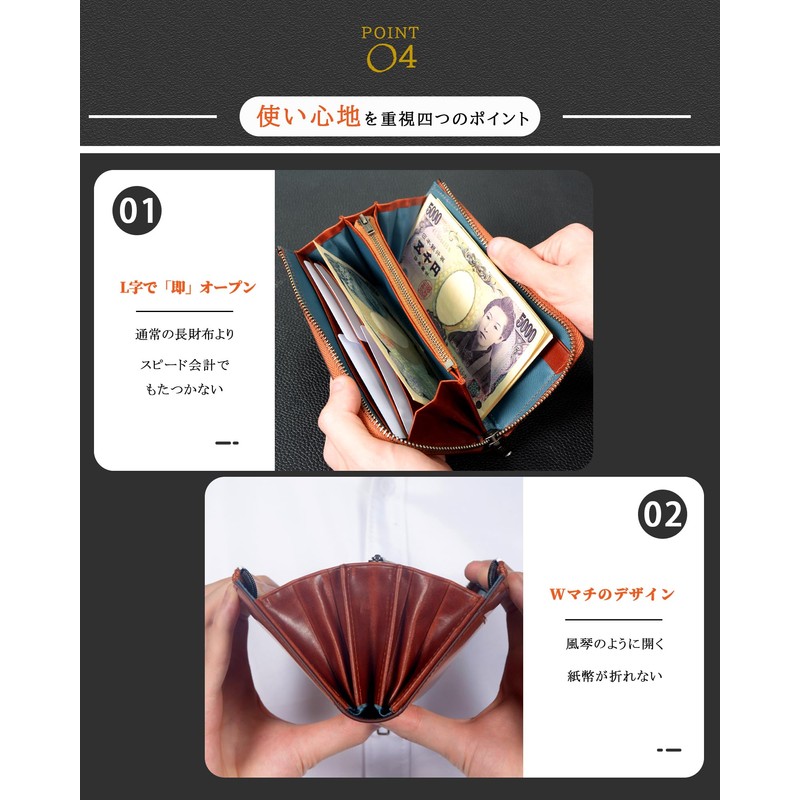 • [Payment speedy design] The "L-shape" design makes it easier to open than a regular long wallet. "Double YKK zippers" inside and outside for smooth opening and closing. The "W gusset" allows the wallet and divider to spread wide on both sides, making it easy to see and retrieve bills without breaking. You can use your wallet as you like, whether you are right or left handed