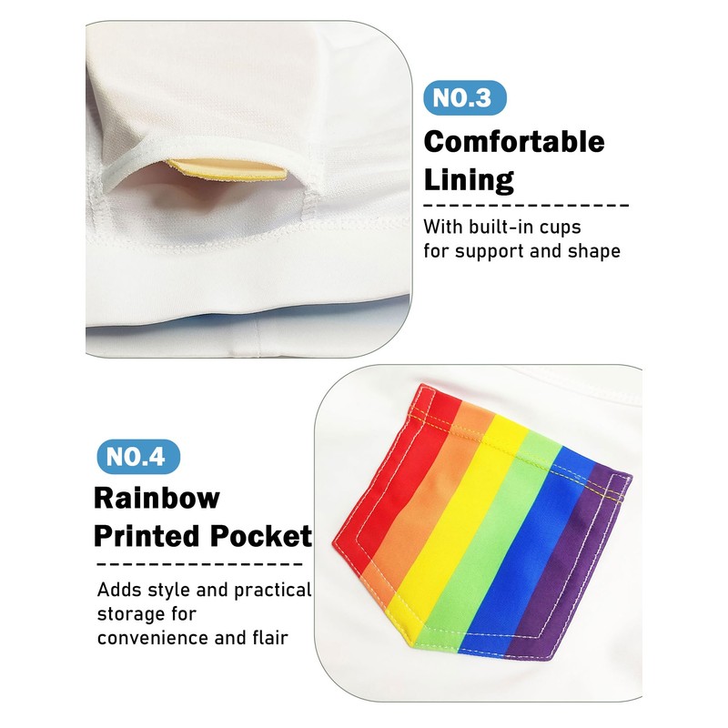 - RAINBOW POCKET: Add a playful twist to your swimwear with a vibrant rainbow-colored pocket. This unique design detail not only adds a touch of personality to your look but also serves as a practical storage solution for holding essentials like keys or a small wallet