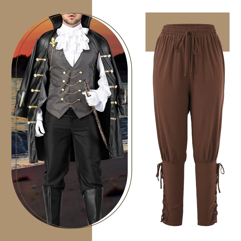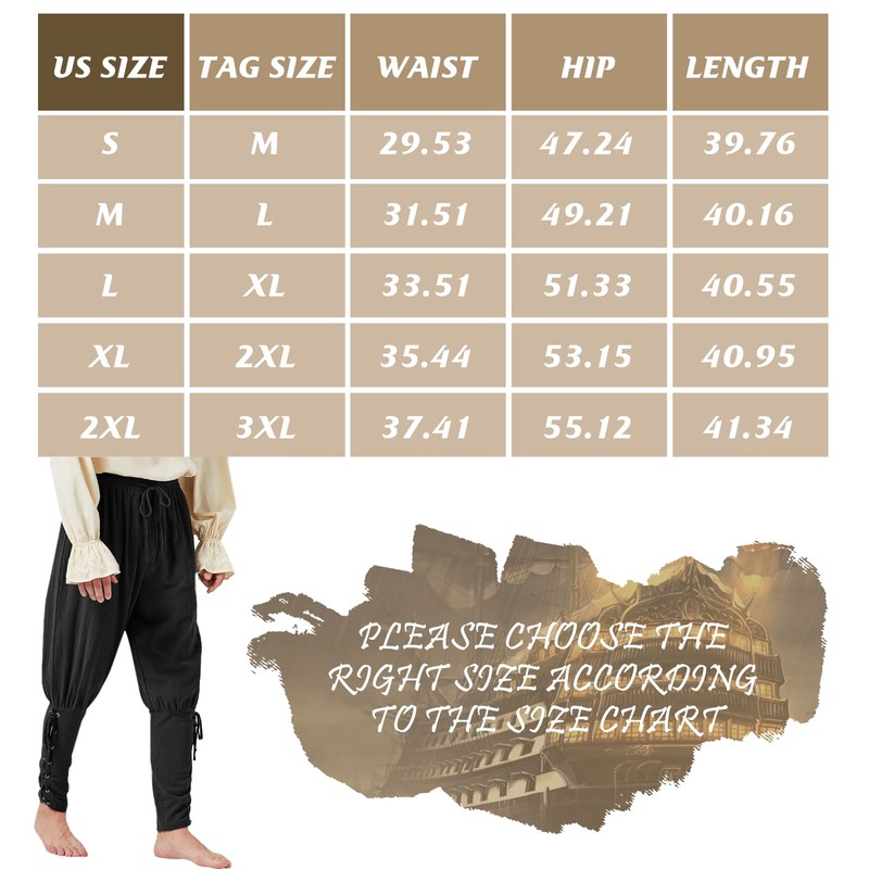 - ⇒ Color & Size : Our pirate pants have 5 classic colors to choose, Black, Brown, Army Green, Navy Blue and Grey. Size: S、M、L、XL、2XL available. There may be 1-3 inch difference due to manual measurement.