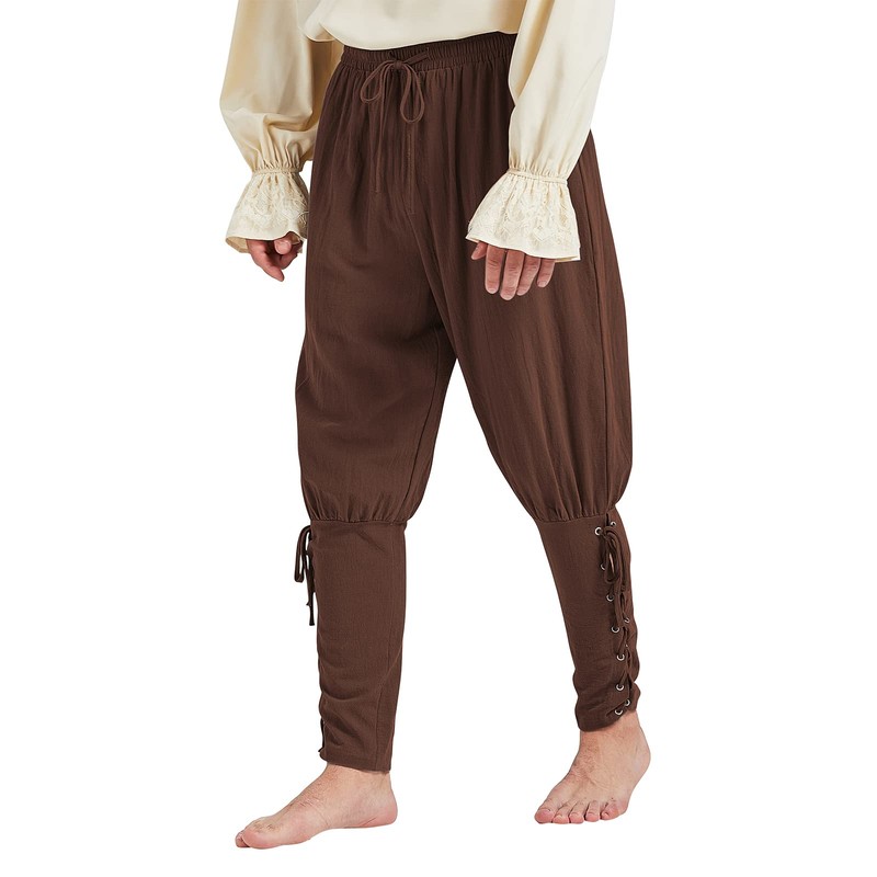 Men's Pirate Renaissance Pants with Ankle Banding - Medieval Viking Navigator Costume Cosplay - Drawstrings, Brown, X-Large