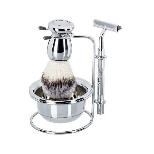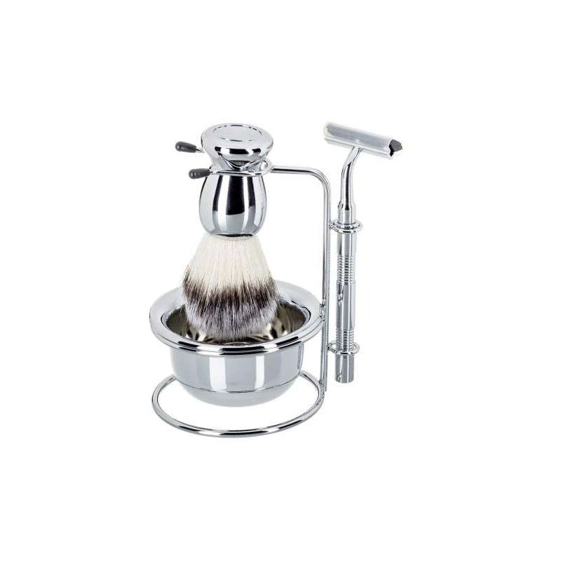 Men's razor set with sturdy shell, soft brush and wet razor in chrome