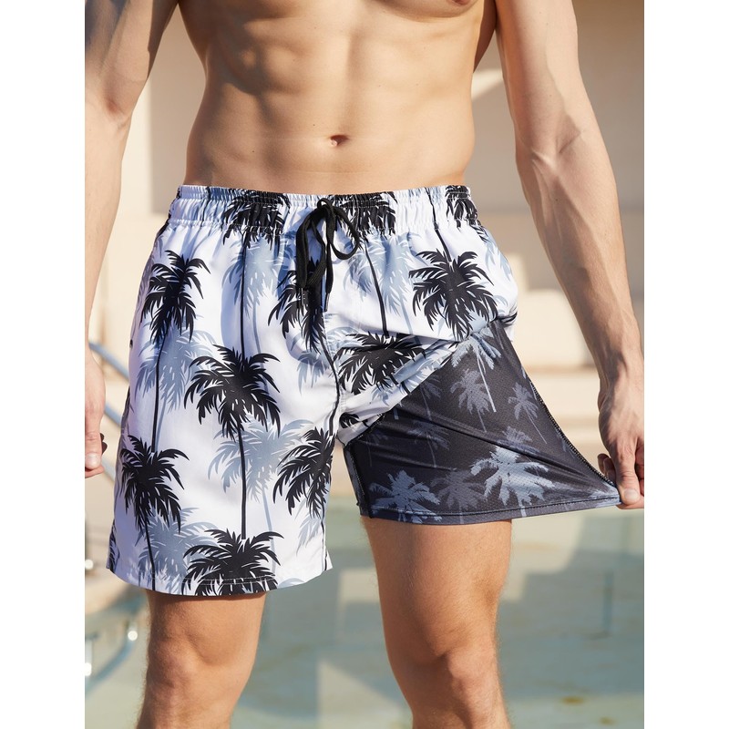Men's Swim Trunks Men 5 Inch Balck Hawaiian Swim Board Short with Compression Liner Quick Dry White Palm Tree Bathing Suit