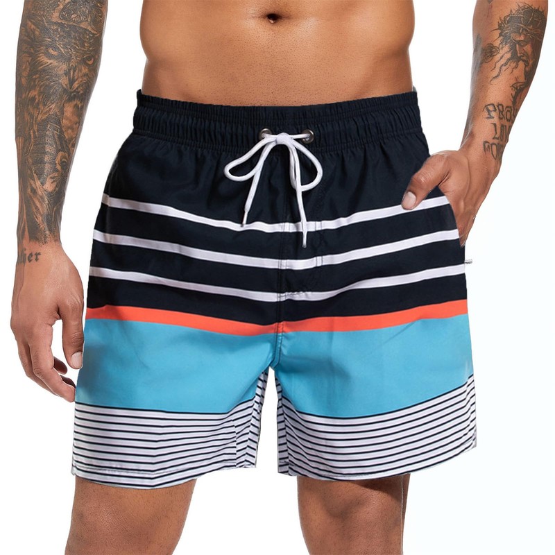 Men's Swim Trunks Quick Dry Beach Shorts with Compression Liner Swimming Shorts with Zipper Pockets Striped Navy S