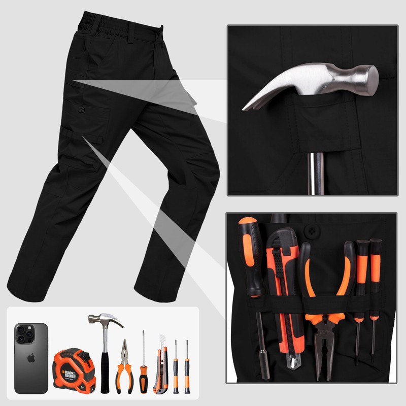 - 7-Pocket Cargo Work Pants – Carry More, Work Smarter! Two deep front pockets – Secure essentials with ease. One magazine pocket – Perfect for tools, phones, or tactical gear. One carpenter-style thigh pocket (right leg) – Organize screws, bits, or small tools. One cargo pocket (left leg) – Expandable space for bulky items. Two velcro hip pockets (back) – Lock in larger gear. These mens cargo pants are comfortable enough to wear every day, durable enough to stand up to heavy use!