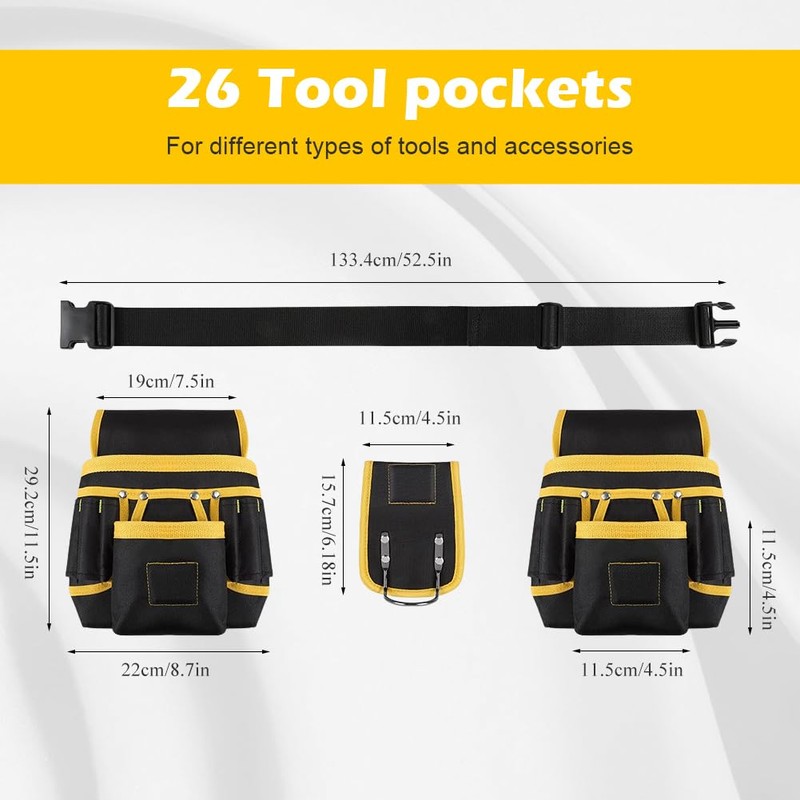 - VERSATILE 26 TOOL POCKETS Total 26 pockets for work tools. There is enough space for nails, hammers, screwdrivers, tape measure, etc. The intelligent pocket placement makes it ergonomic, keeps your basic tools handy without hindering you.