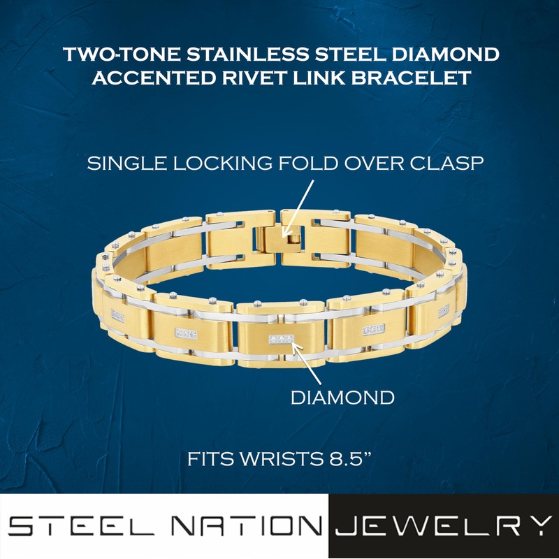 - CRAFTED WITH PRECISION, this 13mm bracelet features a sturdy stainless steel construction with a luxurious two-tone finish. Highlighted by genuine diamond accents (H-I color, I2-I3 clarity), it showcases Steel Nation Jewelry's commitment to quality and elegance. The secure foldover clasp ensures a reliable fit, embodying both comfort and style in a single accessory.