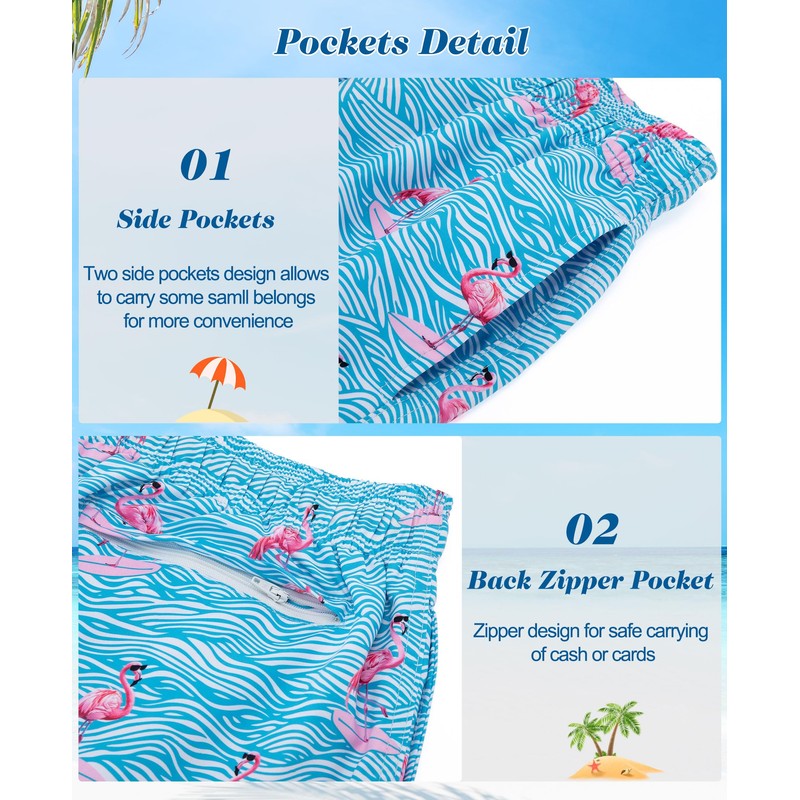 - Men bathing suits with pockets. Come with 2 side mesh pockets and 1 built-in pocket on liner, offering a secure place to store personal belongings like cards and keys.