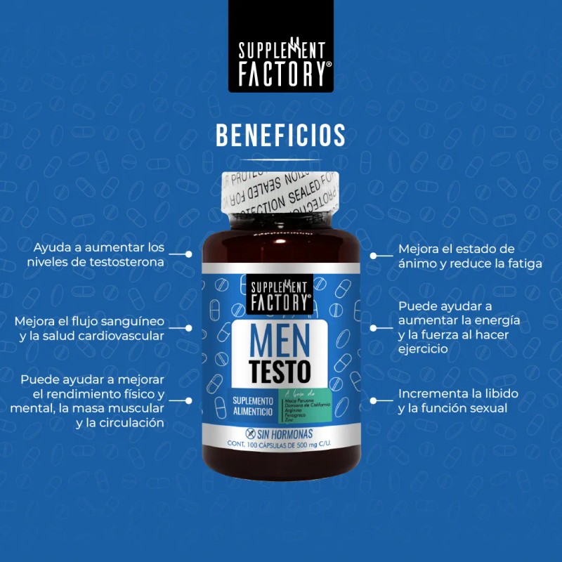 SUPPLEMENT FACTORY - Men Testo 100 cápsulas, Testosterona Hombre, 100% natural, Precursor de Origen natural, Sin Hormonas, Ingredientes de la + Alta Calidad, Maca Negra, Damiana, Fenogreco, Arginina, Zinc. ✨ Producto de calidad premium con excelentes reseñas. Materiales de primera calidad y diseño funcional. 🔥 Alta demanda - Stock limitado. Ideal para quienes buscan lo mejor en calidad y estilo. Producto auténtico con satisfacción total asegurada. ¡No te quedes sin el tuyo y aprovecha esta oportunidad única!