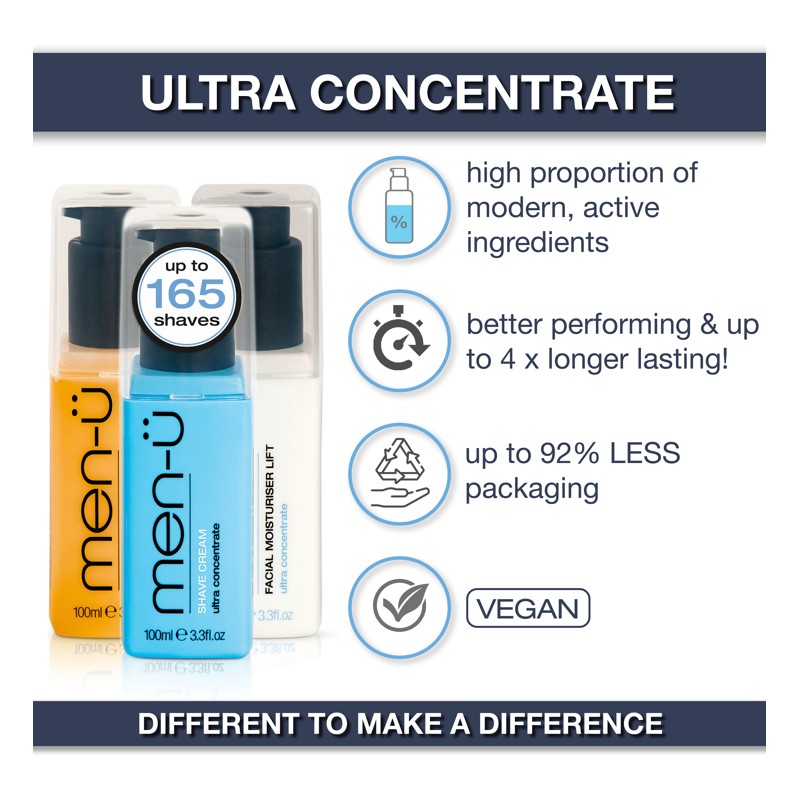 What are the benefits and features of men-ü Ultimate Shave / Skin Kit?- Shave Cream is packed with lubricants including silicone and moisturisers that create a smooth ride for the razor.