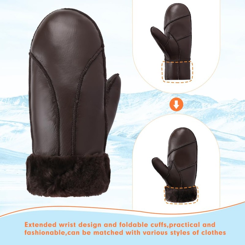 • These Sheepskin Shearling mittens Specialized by craftsmen hand sewing ,feature an extended wrist design and foldable cuffs,Classic mitten styling fit great with most hand sizes,thick warm but not bulky,stay warm during your outdoor sports and activities.