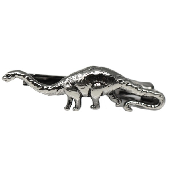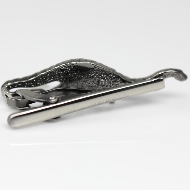 - High quality brushed gunmetal tone novelty vintage dinosaur tie bar, clip from left side.