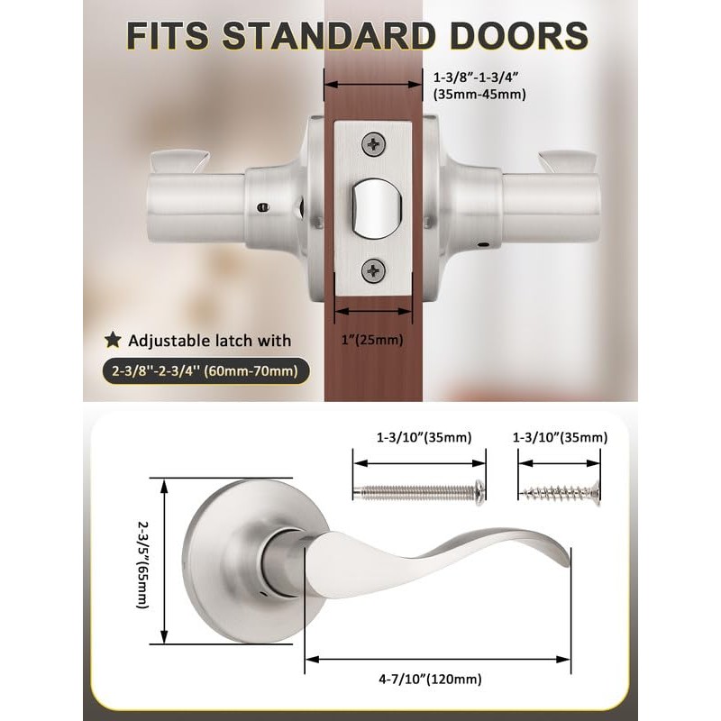 ◆Adjustable Latch:60mm(2-3/8") or 70mm (2-3/4") latch; Fit all doors of 35 to 45 mm(1-3/8" to 1-3/4")thickness. The latch plate is unremovable.