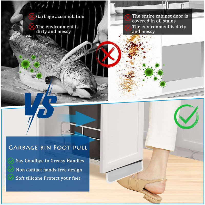 - 2.Trash Cabinet Drawer Foot Pulls For Hands Free Operation: The Trash Drawer Foot Pull Can Easy-To-Use Foot Operated, Trash Cabinet Foot Opener Allows You To Open Cabinet Doors Around Your Office And/Or Home Simply By Using Your Foot. Avoid Contact With Commonly Touched Cabinet Handles Or Open Them When Your Hands Are Full. Perfect For Trash Bin Doors, The Break Room, And Other Cabinets That Usually Require You To Use Your Hands To Open Them
