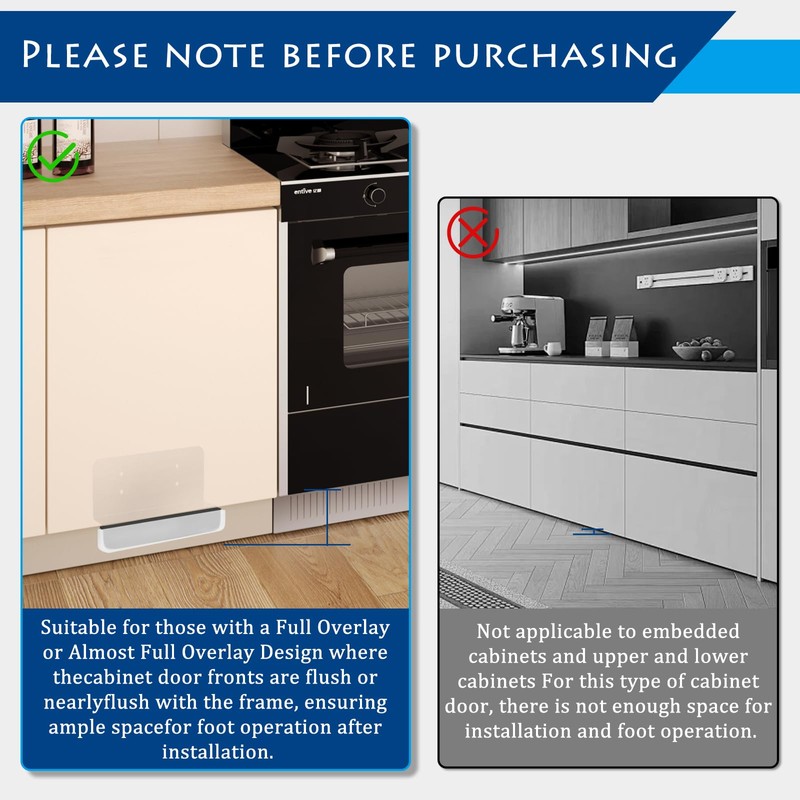 - 1.Warm Tip:The Foot Pull For Trash Cabinet Drawer Only Fits Cabinets Whose Base And Frame Are Fully Flush Or Almost Fully Flush.If Extra Wood Is Bottom Of The Cabinet Door,The Hands-Free Cabinet Foot Pulls Is Not Suitable .The Under Cabinet Foot Pull Does Not Work On Recessed/Inset Cabinets.The Cabinet Foot Pull Is Designed For Modern Kitchen Waste Bins And Will Fit Most Modern Cabinets, But Not All Cabinets Are The Same So It Is Best Practice To Check Or Measure Your Cabinets Before You Buy.