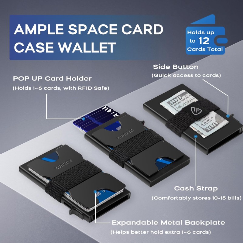 - Quick Access & Expandable Capacity (Holds 1-12 Cards): Experience effortless card access with our patented pop-up button mechanism – press to instantly eject cards. The main aluminum card holder compartment holds 4-6 cards(depending on embossed designs), while the expandable metal backplate adds 6-8 extra slots. *Total capacity varies with card thickness