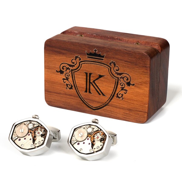 Mens Cufflinks Watch Movement Shape Silve Cuff Links with Initial Walnut Wood Box for Husband Boy Friend Groom Groomsman Wedding (K)