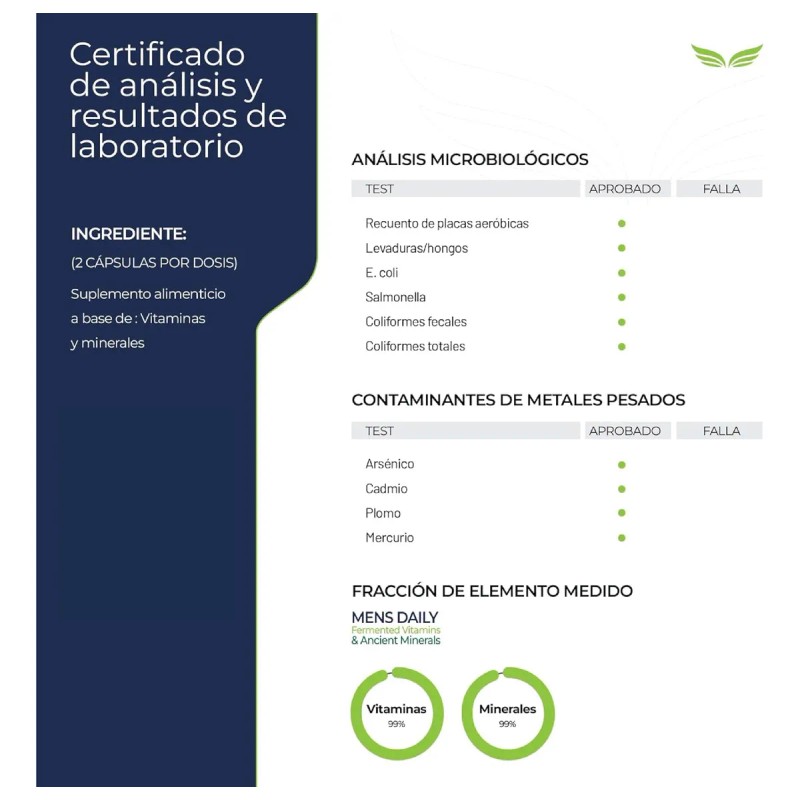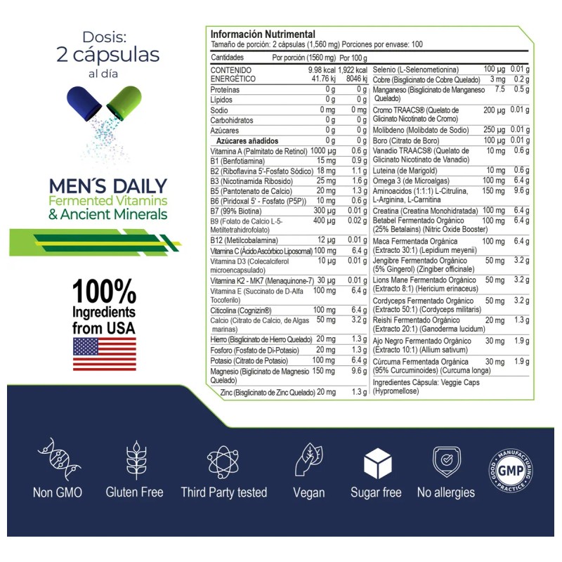 - Acerca de este artículo Calidad Premium: En Eternal Nutrition, nos enorgullece ofrecer productos premium de alta calidad, nos comprometemos a proporcionar pureza y excelencia en cada ingrediente utilizado y garantizamos la calidad probando cada producto en laboratorios acreditados. Mas por tu dinero: Somos una marca justa, nos esforzamos para fabricar los mejores productos a precios justos, no tenemos intermediarios, evitamos gastos adicionales y lo que mas nos importa es tu bienestar. Vitaminas de formas elevadas con alta absorción: La inclusión de vitaminas en formas bioactivas y altamente absorbibles asegura que los nutrientes esenciales sean directamente disponibles para las células, lo que es crucial para optimizar las funciones celulares, desde la producción de energía hasta la reparación y regeneración celular. Esto sustenta directamente el rendimiento físico y mental, al asegurar que las células trabajen de manera eficiente y efectiva. Minerales quelados: La quelación mejora la biodisponibilidad de los minerales, facilitando su absorción y utilización por parte del cuerpo. Los minerales son cofactores esenciales en numerosas reacciones enzimáticas a nivel celular que apoyan el metabolismo energético, la salud ósea, y la función muscular y nerviosa, fundamentales para mantener la potencia y el rendimiento. Extractos de plantas y adaptogenos fermentados: La fermentación no solo mejora la biodisponibilidad de los nutrientes sino que también produce metabolitos secundarios beneficiosos, como ácidos orgánicos, peptidos, y antioxidantes, que pueden proteger las células del daño oxidativo y apoyar el bienestar y la salud digestiva, contribuyendo a un rendimiento óptimo a nivel celular. Complejo específico para hombres: La fórmula incluye ingredientes como aminoácidos, betabel (para la producción de óxido nítrico), creatina (para el apoyo energético), omega 3 (para la salud cardiovascular y cognitiva), y luteína (para la salud ocular), que juntos ofrecen un apoyo nutricional enfocado en las necesidades específicas del hombre moderno. Estos componentes trabajan en conjunto para apoyar la resistencia física, la claridad mental, la salud cardiovascular y visual, así como para mejorar la recuperación muscular y el manejo del estrés. Mens Daily Fermented Multivitamins & Ancient Minerals ¿Sabes qué hace diferente a Mens Daily de Eternal Nutrition? En Eternal Nutrition, nuestro compromiso principal es con la calidad y la potencia de cada ingrediente. Nos comprometemos a que cada componente en nuestros productos cumpla con los estándares más rigurosos y nos esforzamos por garantizar un valor justo, para que nuestros clientes reciban el valor genuino en cada compra. Mens Daily Fermented Multivitamins & Ancient Minerals nace de esta filosofía. 13 Vitaminas Elevadas de alta Absorción 13 Minerales Quelados 8 adaptogenos probados con Omega 3 + Luteina + Citicolina + Aminos a a a a Vitaminas de formas Fermentadas con alta absorción Las vitaminas en formas bioactivas y fermentadas son altamente absorbibles asegura que los nutrientes esenciales sean directamente disponibles para las células, lo que es crucial para optimizar las funciones celulares, desde la producción de energía hasta la reparación y regeneración celular. Esto sustenta directamente el rendimiento físico y mental, al asegurar que las células trabajen de manera eficiente y efectiva. Minerales Quelados La quelación mejora la biodisponibilidad de los minerales, facilitando su absorción y utilización por parte del cuerpo. Los minerales son cofactores esenciales en numerosas reacciones enzimáticas a nivel celular que apoyan el metabolismo energético, la salud ósea, y la función muscular y nerviosa, fundamentales para mantener la potencia y el rendimiento. Adaptogenos Fermentados La fermentación no solo mejora la biodisponibilidad de los nutrientes sino que también produce metabolitos secundarios beneficiosos, como ácidos orgánicos, peptidos, y antioxidantes, que pueden proteger las células del daño oxidativo y apoyar el bienestar general y la digestion, contribuyendo a un rendimiento óptimo a nivel celular. Complejo específico para hombres La fórmula incluye ingredientes como aminoácidos, betabel para la producción de óxido nítrico, creatina para el apoyo energético, omega 3 para la salud cardiovascular, Cognizin, Citicolina para la salud cognitiva, y luteína para la salud ocular, que juntos ofrecen un apoyo nutricional enfocado en las necesidades específicas del hombre moderno. Estos componentes trabajan en conjunto para apoyar la resistencia física, la claridad mental, la salud cardiovascular y visual, así como para mejorar la recuperación muscular y el manejo del estrés. Aviso legal
