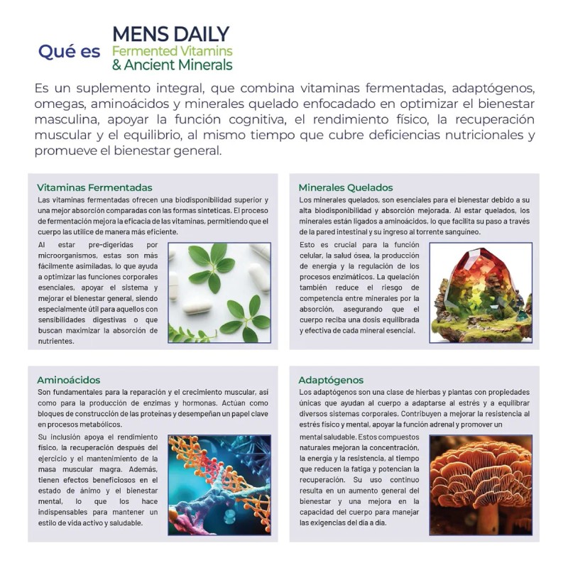 - Acerca de este artículo Calidad Premium: En Eternal Nutrition, nos enorgullece ofrecer productos premium de alta calidad, nos comprometemos a proporcionar pureza y excelencia en cada ingrediente utilizado y garantizamos la calidad probando cada producto en laboratorios acreditados. Mas por tu dinero: Somos una marca justa, nos esforzamos para fabricar los mejores productos a precios justos, no tenemos intermediarios, evitamos gastos adicionales y lo que mas nos importa es tu bienestar. Vitaminas de formas elevadas con alta absorción: La inclusión de vitaminas en formas bioactivas y altamente absorbibles asegura que los nutrientes esenciales sean directamente disponibles para las células, lo que es crucial para optimizar las funciones celulares, desde la producción de energía hasta la reparación y regeneración celular. Esto sustenta directamente el rendimiento físico y mental, al asegurar que las células trabajen de manera eficiente y efectiva. Minerales quelados: La quelación mejora la biodisponibilidad de los minerales, facilitando su absorción y utilización por parte del cuerpo. Los minerales son cofactores esenciales en numerosas reacciones enzimáticas a nivel celular que apoyan el metabolismo energético, la salud ósea, y la función muscular y nerviosa, fundamentales para mantener la potencia y el rendimiento. Extractos de plantas y adaptogenos fermentados: La fermentación no solo mejora la biodisponibilidad de los nutrientes sino que también produce metabolitos secundarios beneficiosos, como ácidos orgánicos, peptidos, y antioxidantes, que pueden proteger las células del daño oxidativo y apoyar el bienestar y la salud digestiva, contribuyendo a un rendimiento óptimo a nivel celular. Complejo específico para hombres: La fórmula incluye ingredientes como aminoácidos, betabel (para la producción de óxido nítrico), creatina (para el apoyo energético), omega 3 (para la salud cardiovascular y cognitiva), y luteína (para la salud ocular), que juntos ofrecen un apoyo nutricional enfocado en las necesidades específicas del hombre moderno. Estos componentes trabajan en conjunto para apoyar la resistencia física, la claridad mental, la salud cardiovascular y visual, así como para mejorar la recuperación muscular y el manejo del estrés. Mens Daily Fermented Multivitamins & Ancient Minerals ¿Sabes qué hace diferente a Mens Daily de Eternal Nutrition? En Eternal Nutrition, nuestro compromiso principal es con la calidad y la potencia de cada ingrediente. Nos comprometemos a que cada componente en nuestros productos cumpla con los estándares más rigurosos y nos esforzamos por garantizar un valor justo, para que nuestros clientes reciban el valor genuino en cada compra. Mens Daily Fermented Multivitamins & Ancient Minerals nace de esta filosofía. 13 Vitaminas Elevadas de alta Absorción 13 Minerales Quelados 8 adaptogenos probados con Omega 3 + Luteina + Citicolina + Aminos a a a a Vitaminas de formas Fermentadas con alta absorción Las vitaminas en formas bioactivas y fermentadas son altamente absorbibles asegura que los nutrientes esenciales sean directamente disponibles para las células, lo que es crucial para optimizar las funciones celulares, desde la producción de energía hasta la reparación y regeneración celular. Esto sustenta directamente el rendimiento físico y mental, al asegurar que las células trabajen de manera eficiente y efectiva. Minerales Quelados La quelación mejora la biodisponibilidad de los minerales, facilitando su absorción y utilización por parte del cuerpo. Los minerales son cofactores esenciales en numerosas reacciones enzimáticas a nivel celular que apoyan el metabolismo energético, la salud ósea, y la función muscular y nerviosa, fundamentales para mantener la potencia y el rendimiento. Adaptogenos Fermentados La fermentación no solo mejora la biodisponibilidad de los nutrientes sino que también produce metabolitos secundarios beneficiosos, como ácidos orgánicos, peptidos, y antioxidantes, que pueden proteger las células del daño oxidativo y apoyar el bienestar general y la digestion, contribuyendo a un rendimiento óptimo a nivel celular. Complejo específico para hombres La fórmula incluye ingredientes como aminoácidos, betabel para la producción de óxido nítrico, creatina para el apoyo energético, omega 3 para la salud cardiovascular, Cognizin, Citicolina para la salud cognitiva, y luteína para la salud ocular, que juntos ofrecen un apoyo nutricional enfocado en las necesidades específicas del hombre moderno. Estos componentes trabajan en conjunto para apoyar la resistencia física, la claridad mental, la salud cardiovascular y visual, así como para mejorar la recuperación muscular y el manejo del estrés. Aviso legal