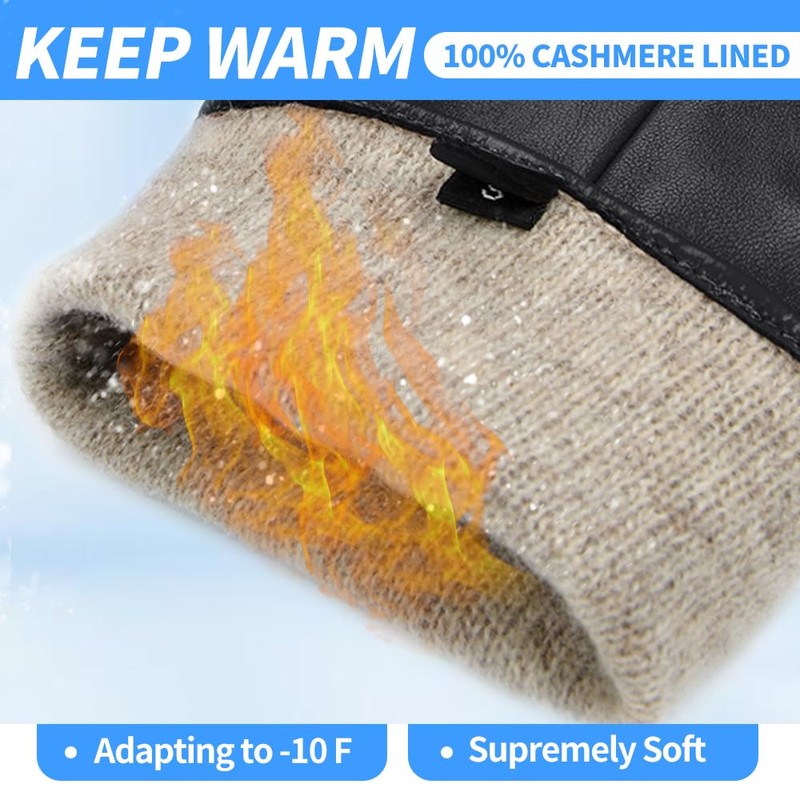 - Men's leather gloves are lined with high quality cashmere, which is soft and skin-friendly and keeps you warm. ,against extreme cold and keeps bitter cold breezes outeffectively protect your hands from cold wind, snow, frostbite and so on. Perfect for cold winter outdoor activities.
