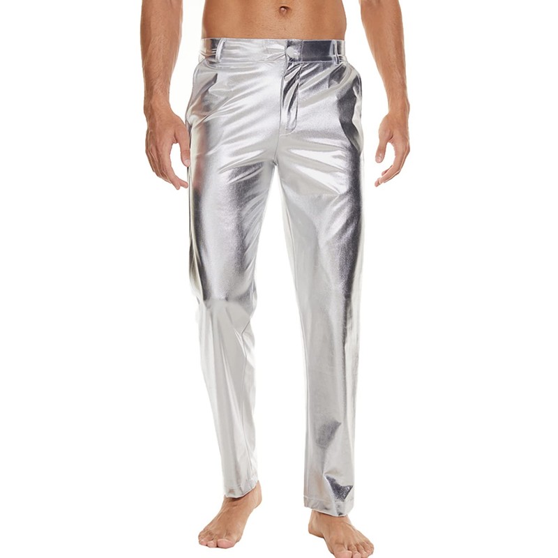Mens Metallic Shiny Disco Pants, Wet Look Party Dance Straight Leg Trousers, 70s/80s Festival Rave Cosplay Leather Pants (Silver, S)