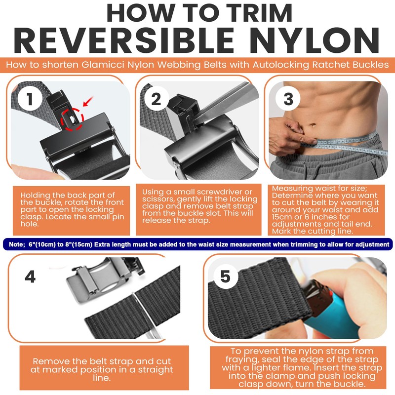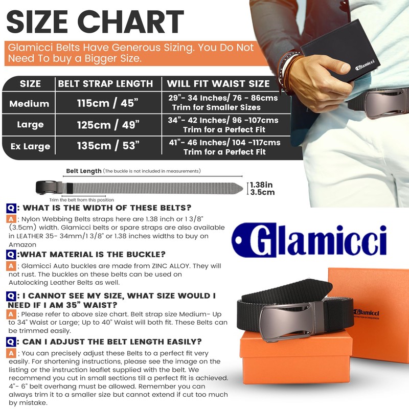 - ✅ FOR AN EXACT FIT – Glamicci Nylon belt straps for men and women allow up to 1/4" adjustment for a perfect fit. This Nylon Web Ratchet belt can be easily trimmed to the right size. We recommend you buy a larger size, cut in small sections till a perfect fit is achieved; you can always cut off more. If your waist is 80cms or 31inches then 80 +15 = 95cms is the correct fitting belt length.