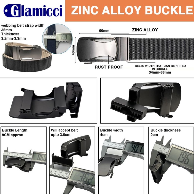 - ✅ BUCKLE & STRAPS: A stylish light weight SCRATCH RESISTANT buckle made to last. The auto buckle on this belt is made of a High-Quality Zinc Alloy with a scratch resistant coating. Buckle Slot for accepting a Ratchet Strap is 34 to 36mm or 1 3/8” (1.41 inches). Auto Locking Leather Belts straps are also available to buy as separate components to assemble into an auto-locking leather belt. If buying as two components to combine; Remember to match the width of the belt strap with Belt fitting Slot in the Buckle. Glamicci Belt Straps here are all 35-36mm wide. AUTO LOCKING RATCHET STRAPS Link; https://www.amazon.co.uk/dp/B0CCNKNJGB?ref=myi_title_dp&th=1