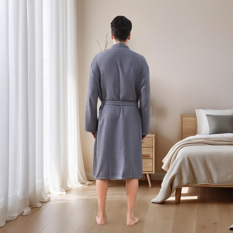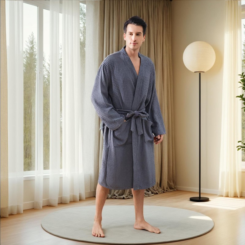 • MEN'S WAFFLE LIGHTWEIGHT ROBE: Our men's waffle robe is a comfortable and stylish loungewear option, made from a soft, textured fabric known as waffle weave. This weave creates a grid-like pattern, offering breathability and a lightweight feel, making it perfect for year-round use.