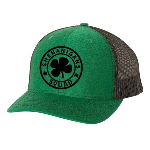 - Mens St. Patrick's Day Shenanigans Squad Clover Embroidered Mesh Back Trucker Hat, Irish Green/Black