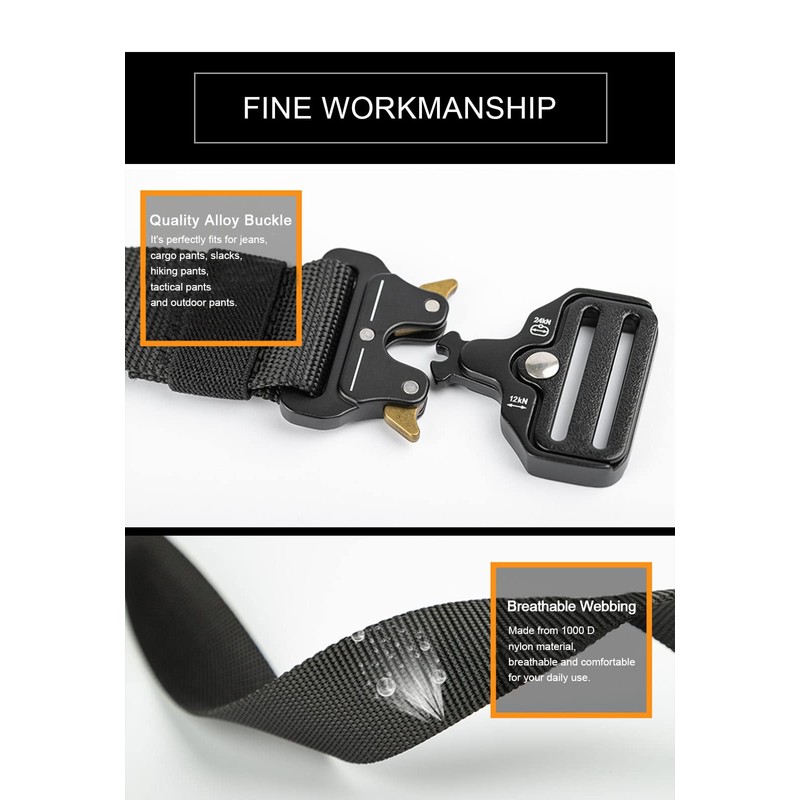 • UPGRADE NYLONTACTICAL BELT:The strap is made by special nylong material which is more solid than regular belt. More than that, it is very sturdy, which make your waist be more comfortable as well as stay tight, when you take large range of activities.The mens belts big and tall can pull over 500 pounds without breaking after hundreds of tests. It supports various cleaning methods and can be used for a long time.