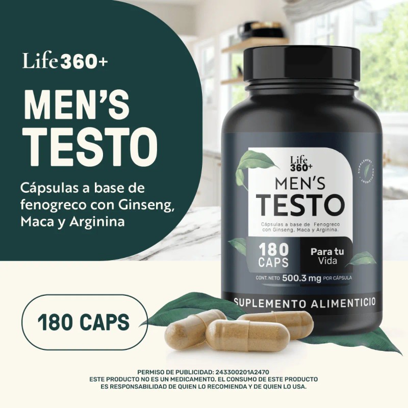 Mens Testo Life360 Fenogreco, Maca, L-Arginina Suplemento Alimenticio Hombre 180 Cpsulas Sin Sabor Testosterona Hombre