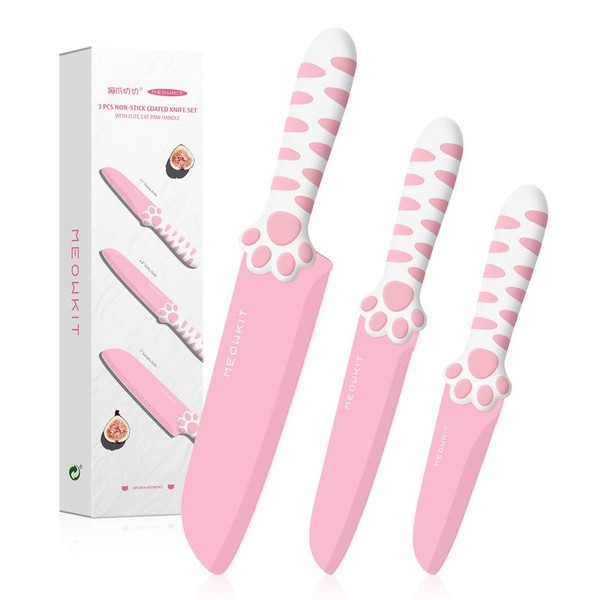Meowkit 3-piece knife set, Kitchen Knife Set for Cooking, Pink Block Kitchen Knives