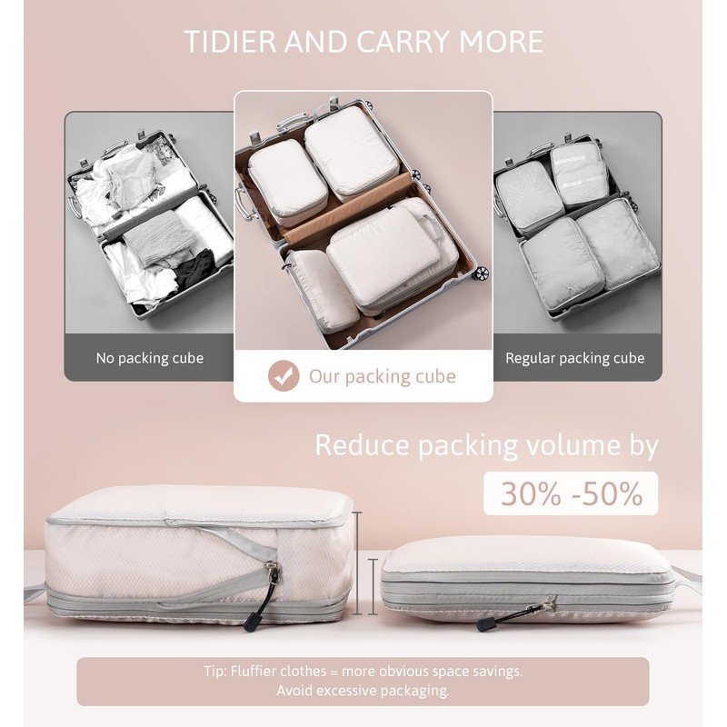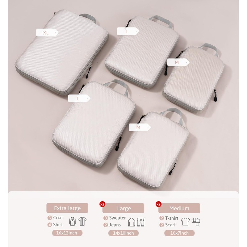 Meowoo 5-Piece Compression Packing Cube Set - Compression Packing Cubes - Waterproof Suitcase Organiser with Zip (XL, 2 x L, 2 x M) - Space Saving for Hand Luggage & Suitcases (Beige)