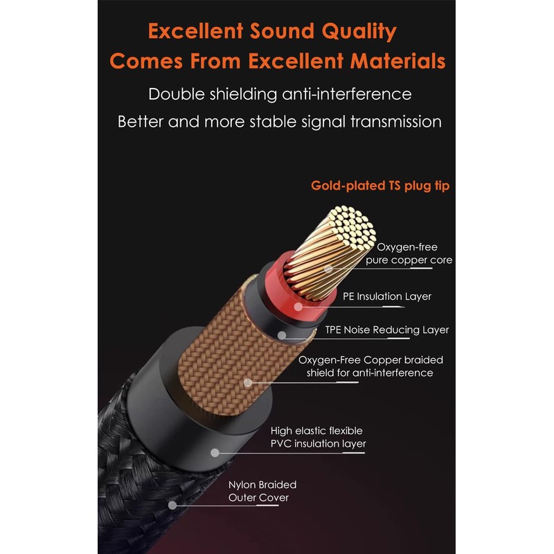 - Excellent sound quality comes from excellent materials. The wire core adopts oxygen-free copper core, gold-plated port tip, TPE noise reducing layer, oxygen-free copper braided shield for anti-interference, high elastic flexible PVC insulation layer, better and more stable signal transmission to ensure excellent sound. Nylon braided cord outer cover, alternately braided in black and white, flexible, durable and fashionable. Anti-oxidation metal connectors are more durable.