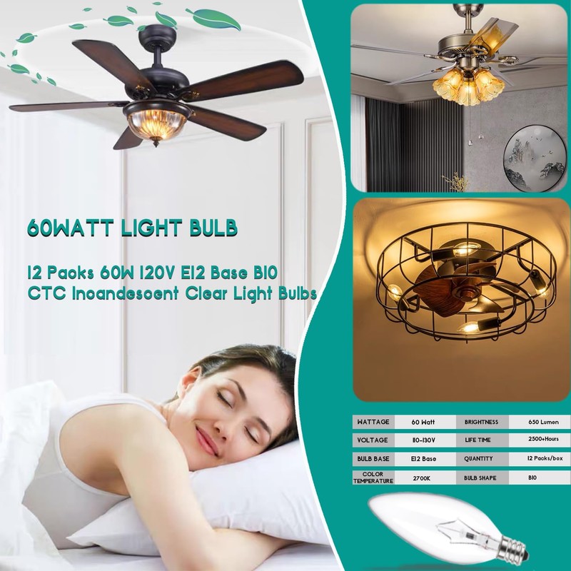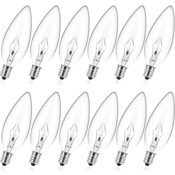 MEQIQTEK E12 60 Watt Incandescent Candle Light Bulbs, Chandelier Light Bulbs for Ceiling Fan, Vanity, Outdoor - Warm White 2500K, 500 Lumen Dimmable B10 Clear Candelabra Base Bulbs (12 Pack)