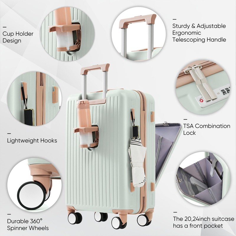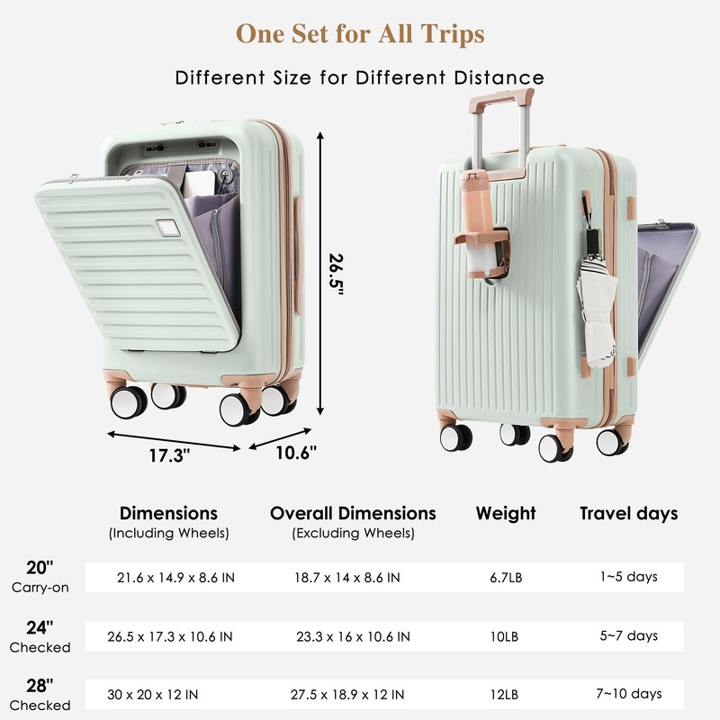 Front Opening Design: The 20" and 24" suitcases feature a front opening design for easy access to your belongings, making packing and unpacking hassle-free