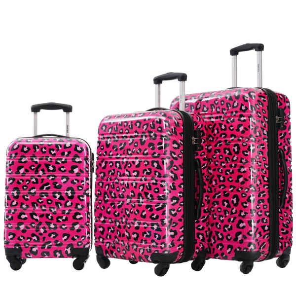 Merax 3 Piece Luggage Sets, Hardside Expandable Luggages Spinner Leopard Suitcase with TSA Lock Lightweight Rolling Carry on Luggage 20inch 24inch 28inch, Hot Pink Leopard