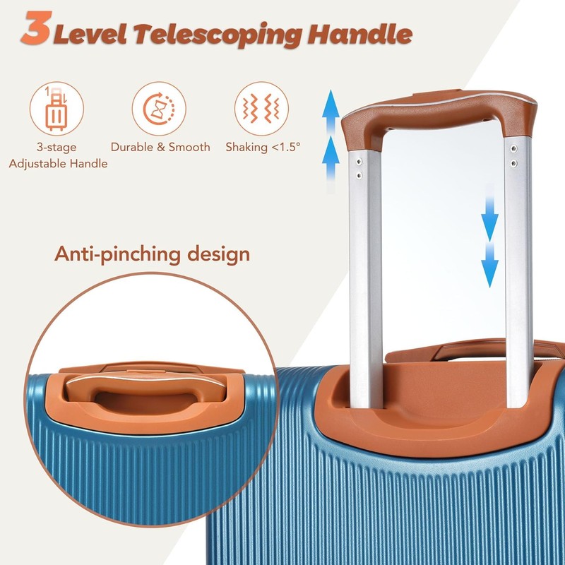 ABS luggage adopts three-dimensional vertical stripes and corner protection design, which not only increases the appearance, but also effectively prevents collisions and scratches, extending the service life. 3-level telescopic handle with humanized anti-pinch design. 360° silent dual wheels are made of high-elastic TPE material. Adjust the height you need and move effortlessly. Bring convenience to travel. Expansion function adds 20% extra space (only for 24-inch and 28-inch). The 24-inch and 28-inch luggage feature reinforced side handles and bumper feet for easy portability. TSA approved combination lock prevents luggage from being opened violently, ensuring the security and privacy of personal belongings. The 210D lining is not easy to scratch and is effectively waterproof, providing better protection for items inside the suitcase.