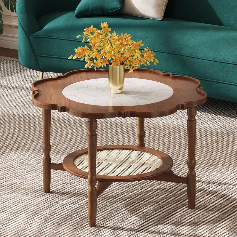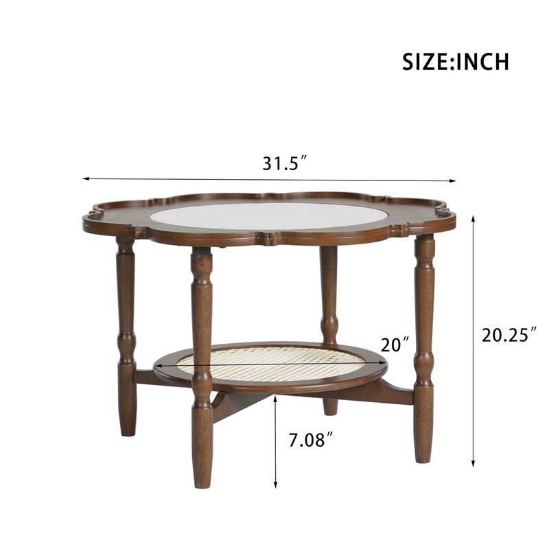 Merax Mid-Century Style Coffee Table with Petal Shape and White Crackle Pattern Glass, Vintage Design 2-Tiered Coffee Table with Rattan, Walnut, 31.5"