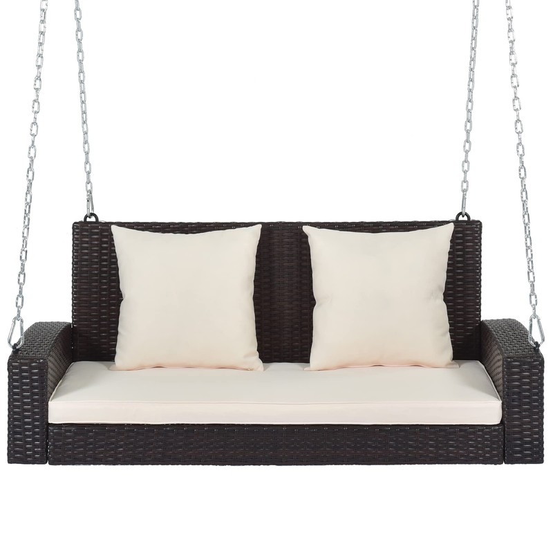 Merax Patio Porch Swing, Outdoor Swing Chair Bench, Wicker Hanging Porch Swing with Chains, Cushion and Pillow, Rattan Swing Bench for Garden, Backyard, Courtyard (Brown+Beige, 1 Piece)