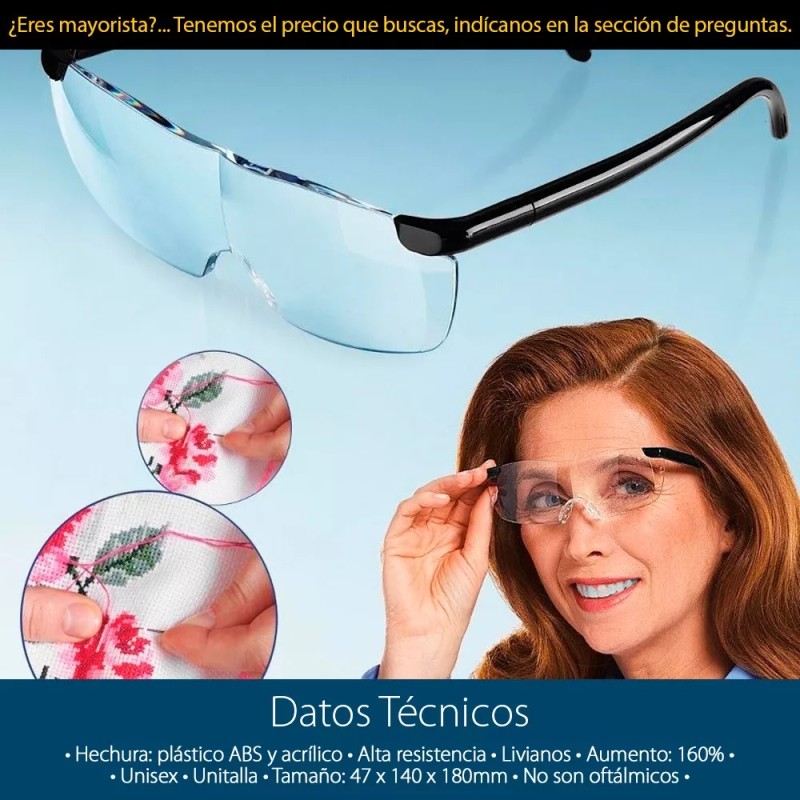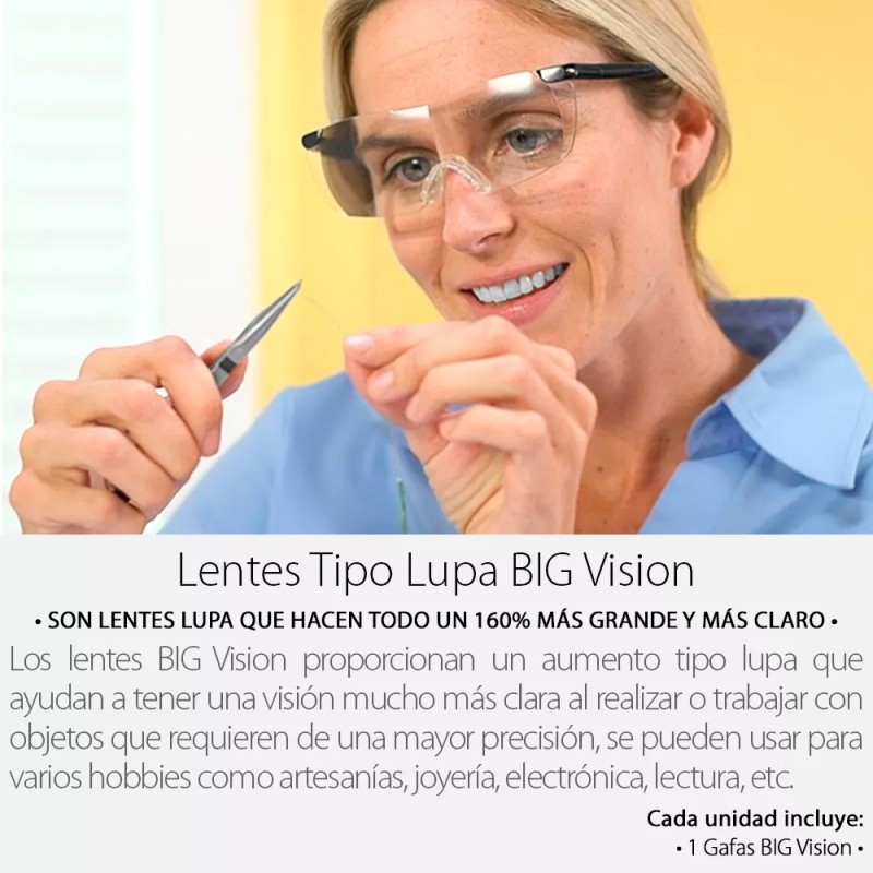 Los lentes BIG Vision proporcionan un aumento tipo lupa que ayudan a tener una visión mucho más clara al realizar o trabajar con objetos que requieren de una mayor precisión, se pueden usar para varios hobbies como artesanías, joyería, electrónica, lectura, etc.