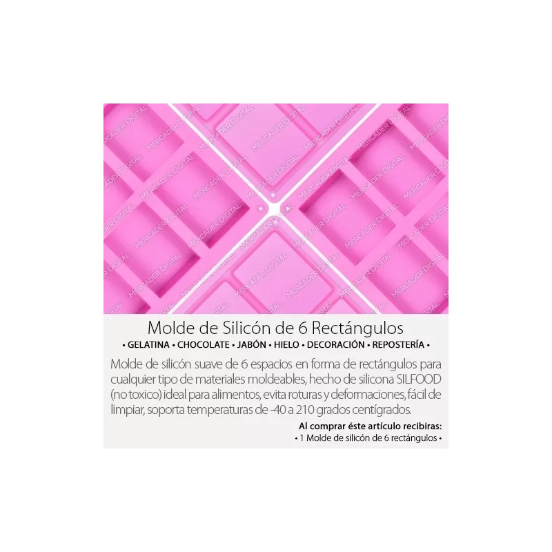Molde de silicón suave de 6 espacios en forma de rectángulos para cualquier tipo de materiales moldeables, hecho de silicona SILFOOD (no toxico) ideal para alimentos, evita roturas y deformaciones, fácil de limpiar, soporta temperaturas de -40 a 210 grados centígrados.