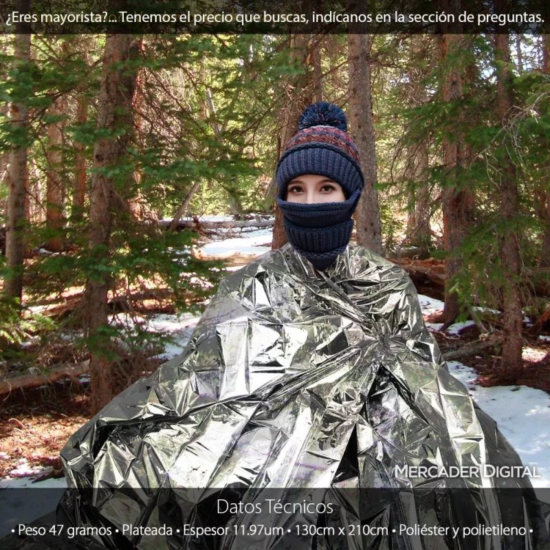 Gran capacidad para mantener el calor corporal y resistir a malas condiciones climáticas, es impermeable de modo que protege de la lluvia, es ligera y compacta para portar fácilmente. Es ideal en situaciones de rescate por su alta reflectancia, es reutilizable y muy resistente al uso constante por su hechura de polímero de poliéster y polietileno.
